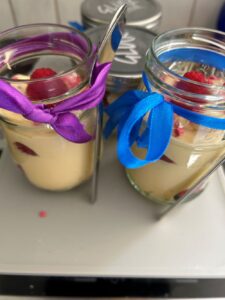 Milch, Vanilleextrakt, Zucker, Sahne in einen Topf geben. Von der Milch zuvor was abnehmen. Damit rühren wir die Speisestärke und die Eigelbe an. Den Topf auf den Herd stellen und einmal unter rühren aufkochen. Vom Herd nehmen und die angerührte Milch, Eigelb, Speisestärke dazugeben und unter Rühren nochmals auf den Herd geben und solange rühren bis ein Pudding entsteht. Den Pudding vom Herd nehmen und in eine Schüssel umfüllen. 20 Minuten abkühlen lassen und dabei immer wieder umrühren. Nun das Eiweiß mit dem Zucker steifschlagen und unter den abgekühlten Pudding geben. In einen Spritzbeutel füllen und jetzt kann man die Gläser befüllen. Ein paar Himbeeren auf den Boden, dann Pudding wieder Himbeeren und abschließen mit Pudding und einer Himbeeren. Wer mag kann noch ein paar backfeste Schokotropfen dazugeben. Mit Schleifen versehen und kalt stellen.