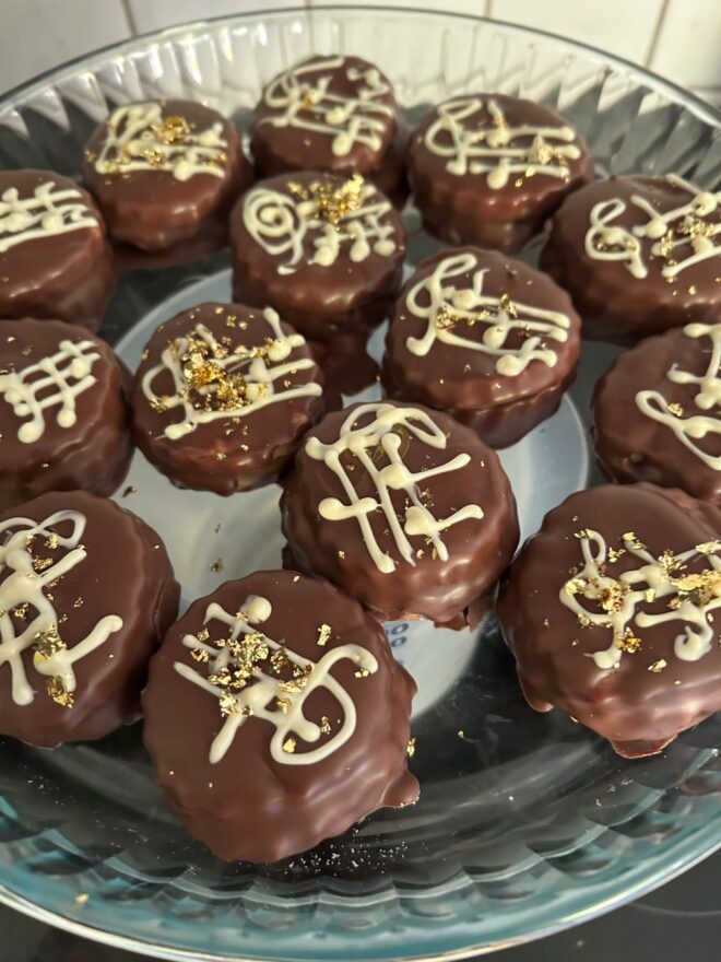 Wer liebt Sie nicht die Musik von Mozart ich dachte wie wäre es mal mit einem Keks zu Ehren des berühmten Komponisten. Er besteht aus einem Mürbeteigkeks bestrichen mit einer Pistaziencreme und einer Schicht aus Nougat und Marzipan überzogen mit einer leckeren Vollmilchkuvertüre garniert mit Goldstaub und einem Notenblatt.