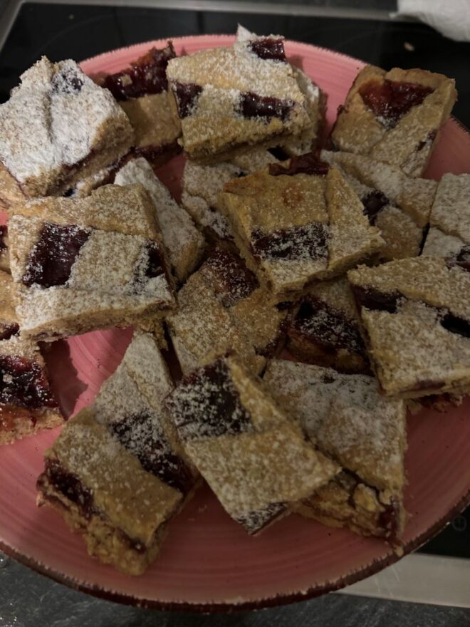 Nach der Kühlzeit Teig auf einer leicht bemehlten Arbeitsplatte geben nochmals durchkneten und ein Drittel davon abnehmen zur Seite stellen. Den restlichen Teig auswellen ca. 4-5 mm dick rechteckig 30 x 20 cm auf ein Backblech geben zuvor mit Backpapier auslegen und den Backrahmen in der Größe drumherumstellen. Teig rein und nun festdrücken. Kirschkonfitüre mit Kirschwasser verrühren und auf den Teig geben und verstreichen geht am besten mit einer Winkelpalette. Nun vom restlichen Teig mit einem Teigrädchen für Teig Streifen schneiden 5 x 2 cm ca. 60 Stück. Diese diagonal mit etwas Abstand auf den Teig legen. Backofen Ober/Unterhitze vorheizen und die Schnitten für ca. 20 – 25 Minuten goldgelb backen. Rausnehmen abkühlen lassen und mit Puderzucker bestäuben. Gutes Gelingen.