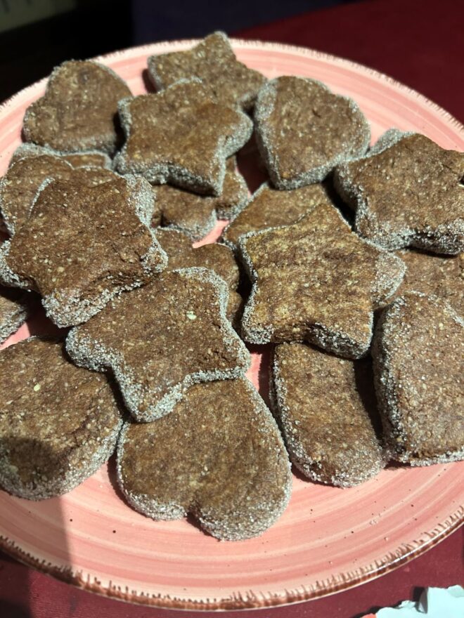 Da der Teig sehr klebrig ist mache ich es immer so, dass ich diesen zwischen Frischhaltefolie ausrollen und zwar 8 mm dick. Mit verschiedenen Ausstecher dann Kekse ausstechen. Auf ein mit Backpapier ausgelegtes Backblech legen und die Kekse über Nacht trocknen lassen. Ihr könnt die Ausstecher vorher noch in Zucker tauchen und dann Kekse ausstechen dann gibt es einen tollen Zuckerrand, diesen sieht man auch noch nach dem backen.