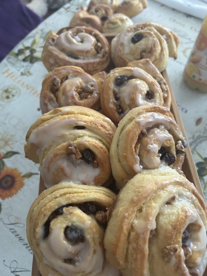 Nach dem Backen rausnehmen 2 Bleche rein und 15 Minuten backen. Das erste Blech mit zerlassener Butter bestreichen. Auskühlen lassen. Wer mag kann noch eine Zitronenglasur über die Schnecken geben aber Puderzucker reicht auch aus.