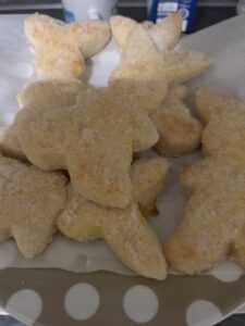 Rausnehmen und nochmals verkneten dann 1 cm auswellen auf einer leicht bemehlten Arbeitsplatte. Hasen ausstechen. Auf ein mit Backpapier ausgelegtes Backblech legen. Backofen auf 175 Grad Ober/Unterhitze vorheizen. Die Hasen mit verquirlten Eimilch bestreichen und für 12-14 Minuten backen. Rausnehmen und mit zerlassener Butter bestreichen und in Zucker wälzen. Dann genießen.