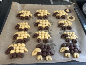 Komplett auskühlen lassen nicht runternehmen zerbrechen sonst. Wer mag kann Sie noch mit Schokolade anmalen und mit Puderzucker und etwas Kokosraspeln dekorieren. Ich habe noch als Auge bei manchen eine kleine Kugel reingedrückt.