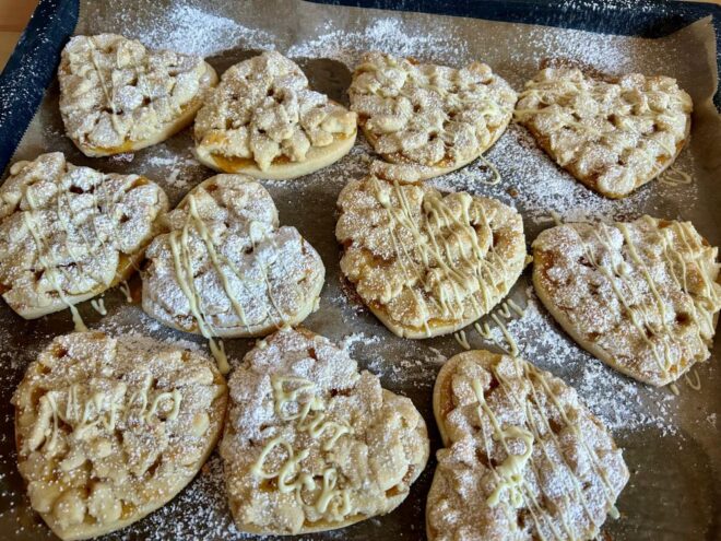Wer Streusel so liebt wie ich der ist hier genau richtig. Aus einem Mandelmürbeteig werden Herzen ausgestochen und mit Marmelade bestrichen. Zum Schluß mit Streuseln versehen gebacken und mit Puderzucker bestäubt ein Genuß und gleichzeitig ein Geschenk für liebe Menschen die man mag. Ein wirklich schönes Mitbringsel! Probiert es aus: