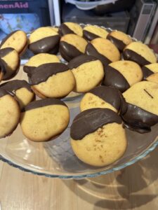 Kuvertüre in eine Schüssel 80 g geben und diese über dem Wasserbad schmelzen bei mittlerer Hitze runternehmen und die restlichen 40 g dazugeben mit dem Kokosöl. Nun die Kekse von einer Seite in die Kuvertüre tunken und auf ein Brett mit Backpapier legen. Kaltwerden lassen und dann hübsch verpacken. Es freut sich jeder darüber.